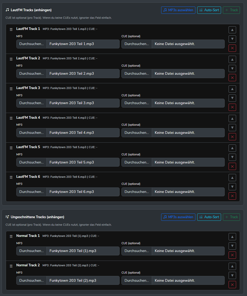 Im anschließenden Uploadfenster können unter den LautFM Tracks und Ungeschnittenen Tracks direkt mehrere MP3s ausgewählt werden. Der Server bemüht sich diese Dateien zu sortieren, sofern ihr sie nummeriert habt.