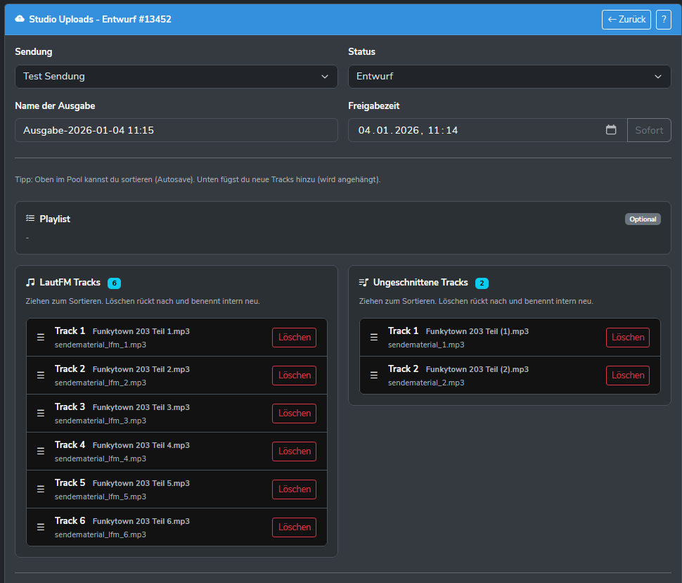 Klickt ihr auf „Uploads“ seht ihr alle vorangegangenen Ausgaben. Klickt ihr nun auf den grünen „Hochladen“ button könnt ihr ein paar Basisdaten eingeben, wie ein Name der Ausgabe (nur für euch), um welche Sendung es geht und die Freigabezeit.